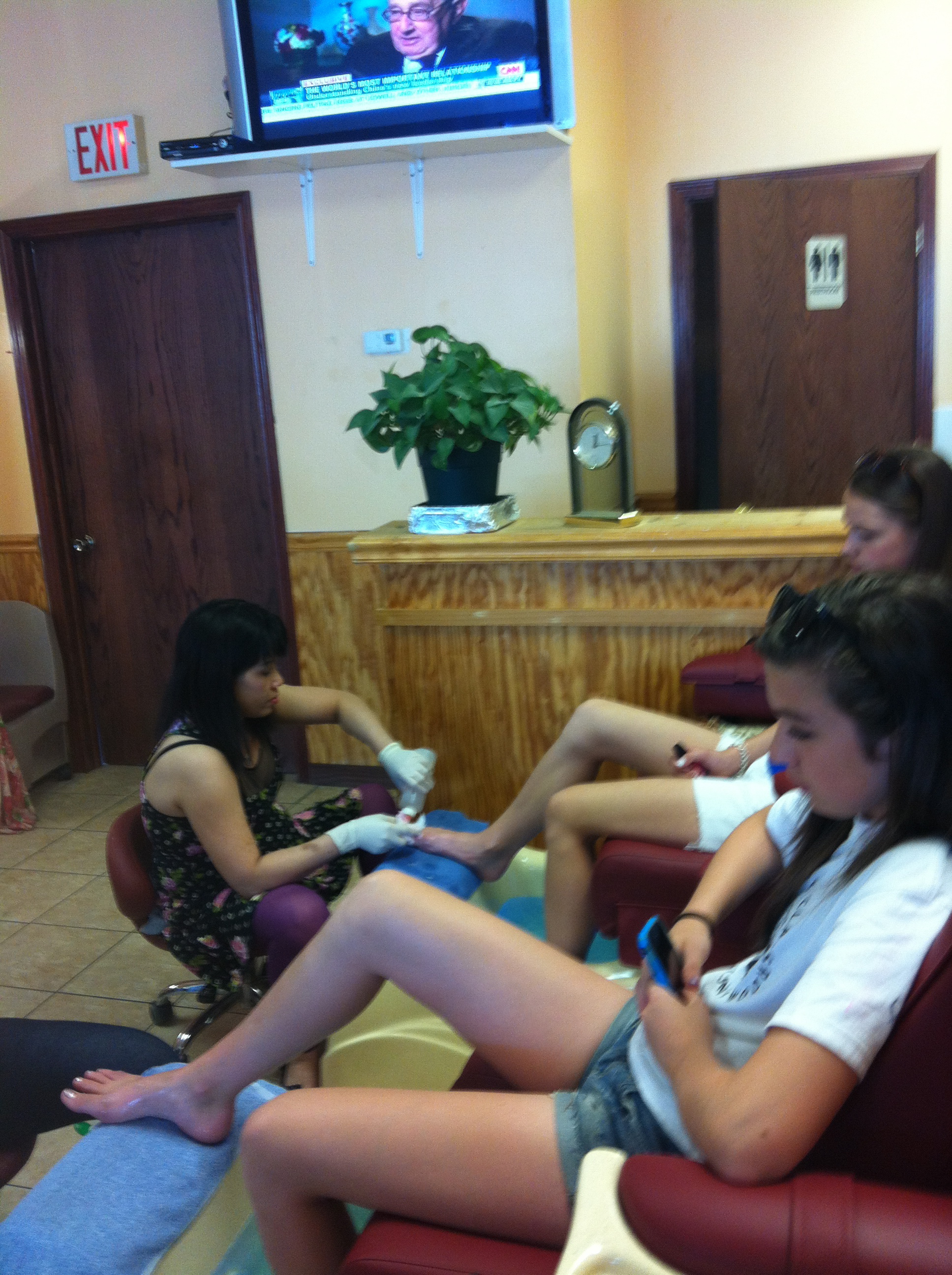 Yesterday I took Lizzie and her friend Sydney for pedicures, where a small man told me, in broken Chinese, that I was too fat for my feet. Had he caught me on another day, I might have crumbled into a quiet mess, but I just started laughing and replied, “That is why I am here! Fix my feet.” He went back to scrubbing my feet and happily muttering, “too many cracks, too many.” These are the kinds of thoughts that are kept on the inside in high end salons, but for $25, you get the blunt truth.